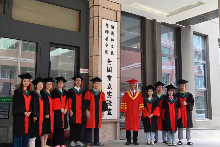 中国科学院院士、中国畜牧兽医学会理事长、国家畜禽遗传资源委员会主任黄路生、江西农业大学杨斌研究员、饶琳博士、张青博士为论文共同通讯作者,江西农业大学蔡丽萍博士、张青博士、姚天雄博士和邹霄霄博士为论文的共同第一作者。本项目11位核心成员,从左到右依次为:蔡丽萍、黄菲、张青、邹霄霄、肖燕园、杨斌、黄路生、饶琳、姚天雄、杨思雨和谢磊。