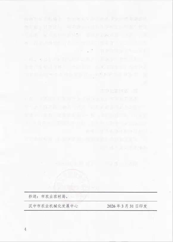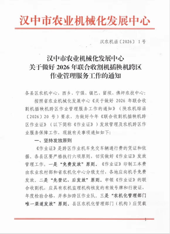 >汉中市农业机械化发展中心关于做好2026年联合收割机插秧机跨区作业管理服务工作的通知