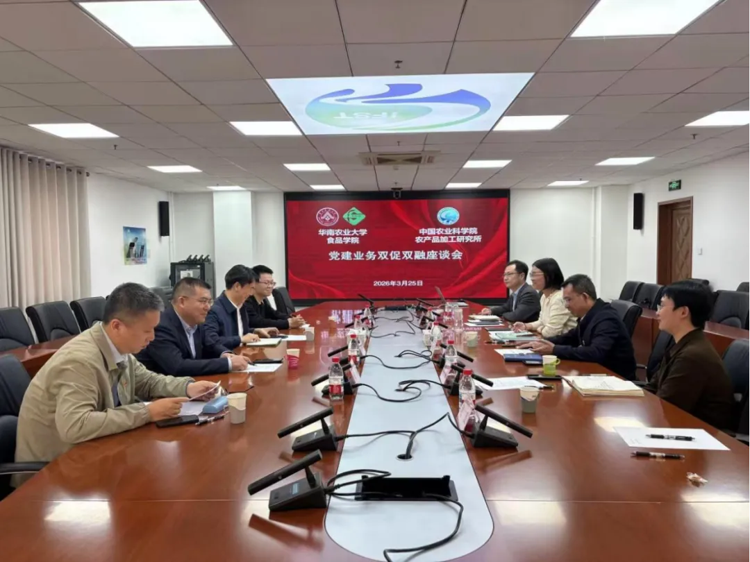 3月25日,华南农业大学食品学院党委书记张阳武、院长徐振林一行到加工所开展党建调研交流,加工所党委副书记、纪委书记邓红亮及相关部门同志参加座谈。邓红亮对张阳武一行表示热烈欢迎。他表示,加工所与华南农大食品学院具有良好的合作基础,双方在农产品加工领域的学科布局、科研方向高度契合,此次调研交流增进了彼此的友谊与了解。未来希望进一步加强党建、科研、人才等方面的常态化交流与合作,充分发挥各自优势,推动资源共享、优势互补,共同助力我国农产品加工产业高质量发展。