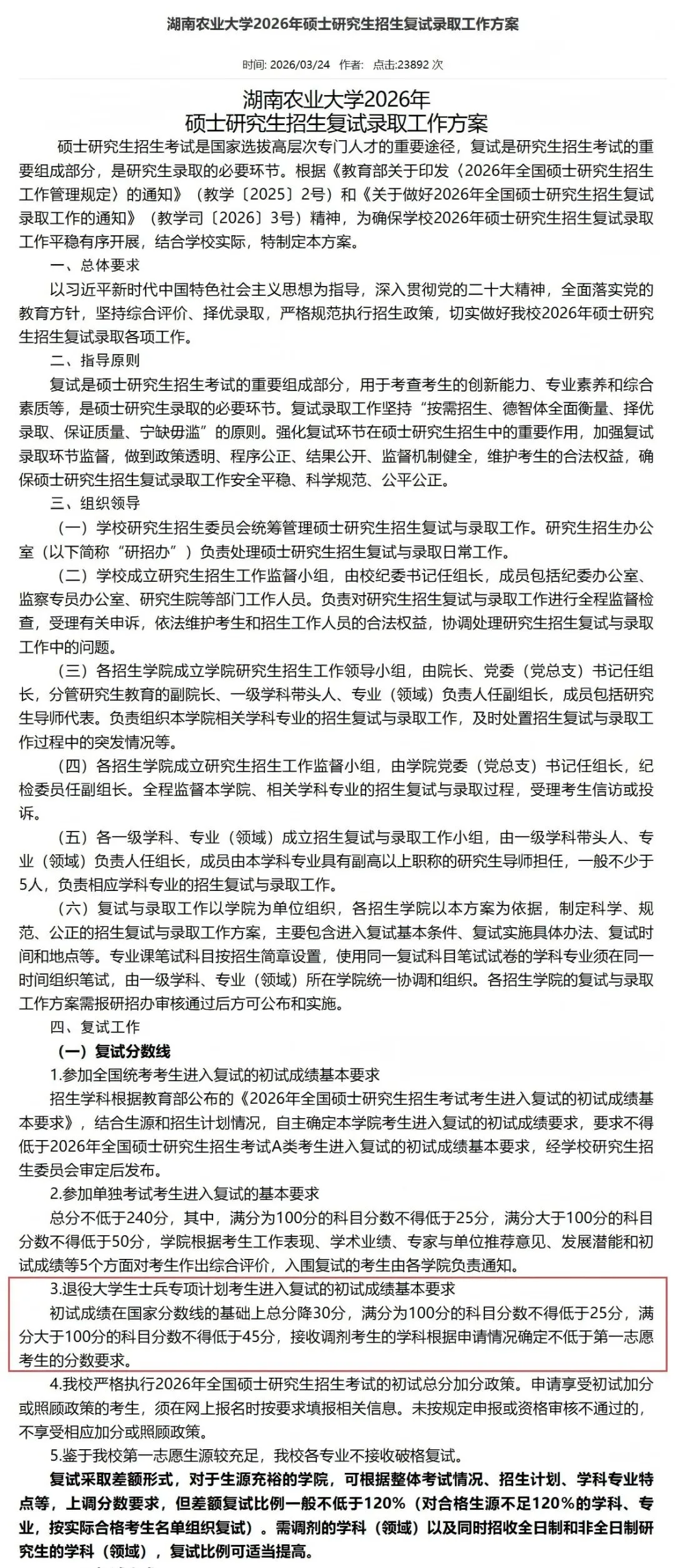 湖南农业大学2026年硕士研究生招生复试录取工作方案