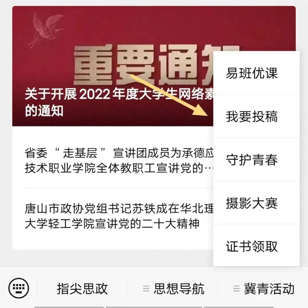 方式二:点击冀网育公众号右下方冀青活动中的“我要投稿”填写完整后即可。