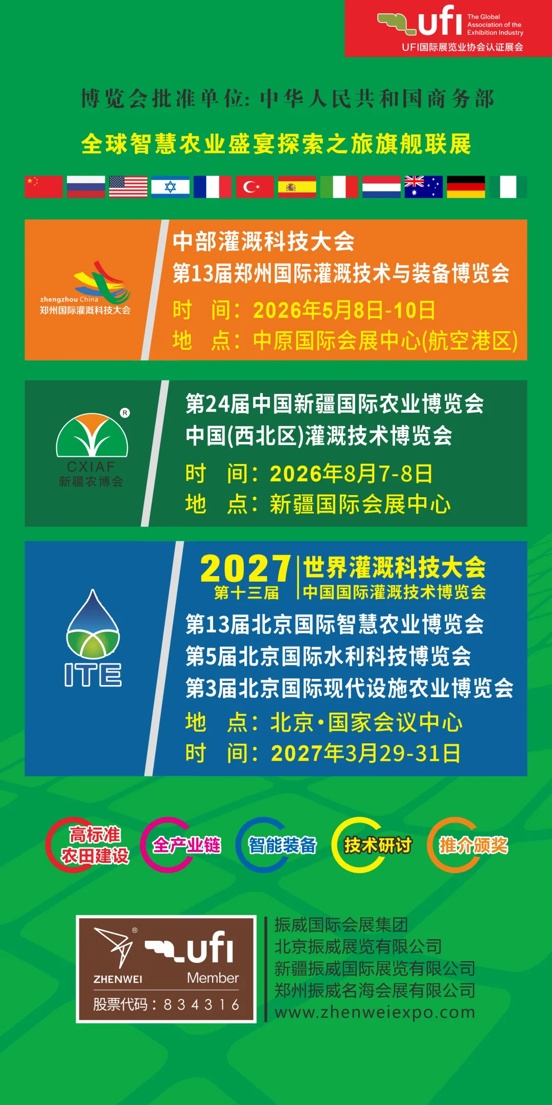 作为本次盛会的主办单位,振威会展深耕产业布局,农业事业部打造了覆盖全国重点农业区域的展会矩阵。3月北京国际灌溉技术博览会,辐射全球60余个国家和地区,搭建国际化灌溉技术交流对接平台;5月郑州国际灌溉技术与装备博览会扎根中原腹地,链接黄淮流域农业产业资源;8月举办新疆国际农业博览会,深耕西北农业市场,助力丝路农业合作与创新发展。