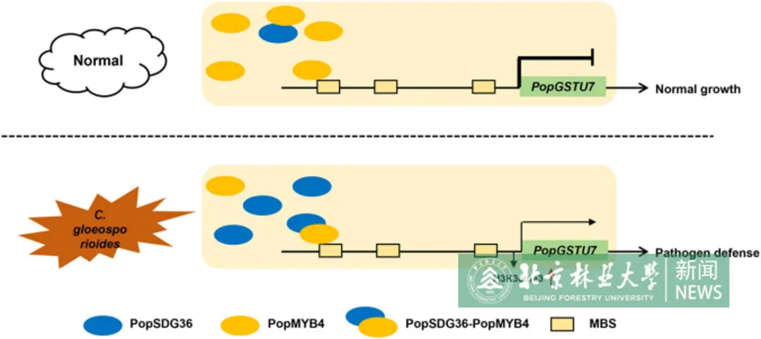 PopMYB4能与组蛋白H3K36me3甲基转移酶PopSDG36发生互作,且PopSDG36是杨树炭疽病抗性的正向调控因子。体外酶活实验证实,PopSDG36具有催化H3K36me3的功能,其过表达能显著提高杨树体内H3K36me3修饰水平。PopSDG36与PopMYB4的相互作用,能解除PopMYB4对PopGSTU7的转录抑制-PopMYB4作为“招募因子”,将PopSDG36带到PopGSTU7的启动子区域,使其发生H3K36me3表观激活修饰,从而显著上调PopGSTU7的表达,恢复ROS代谢平衡,增强杨树抗病性。