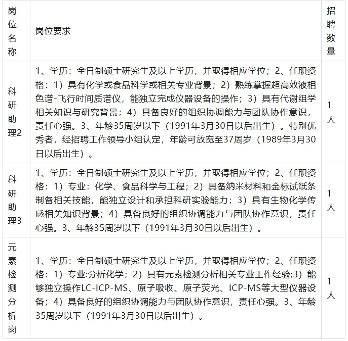江西省农业科学院农产品质量安全与标准研究所成立于1985年,是集检验检测和科技创新为一体的公益性事业单位,主要从事农产品质量安全检验检测、风险评估、营养评价、快速检测技术和过程控制技术等领域的研究和推广应用工作。现根据科研事业发展需要,拟招聘下列合同制工作人员,具体如下: