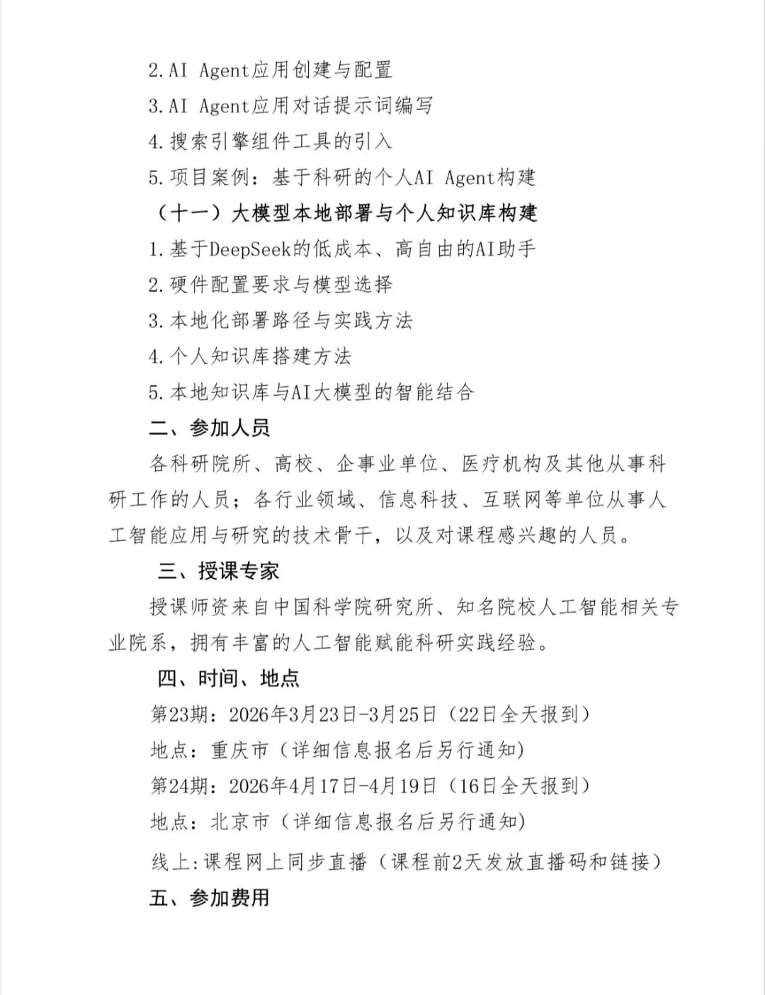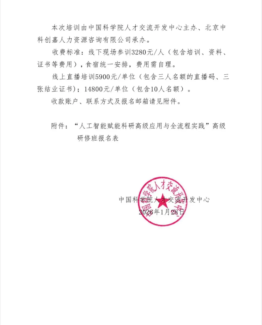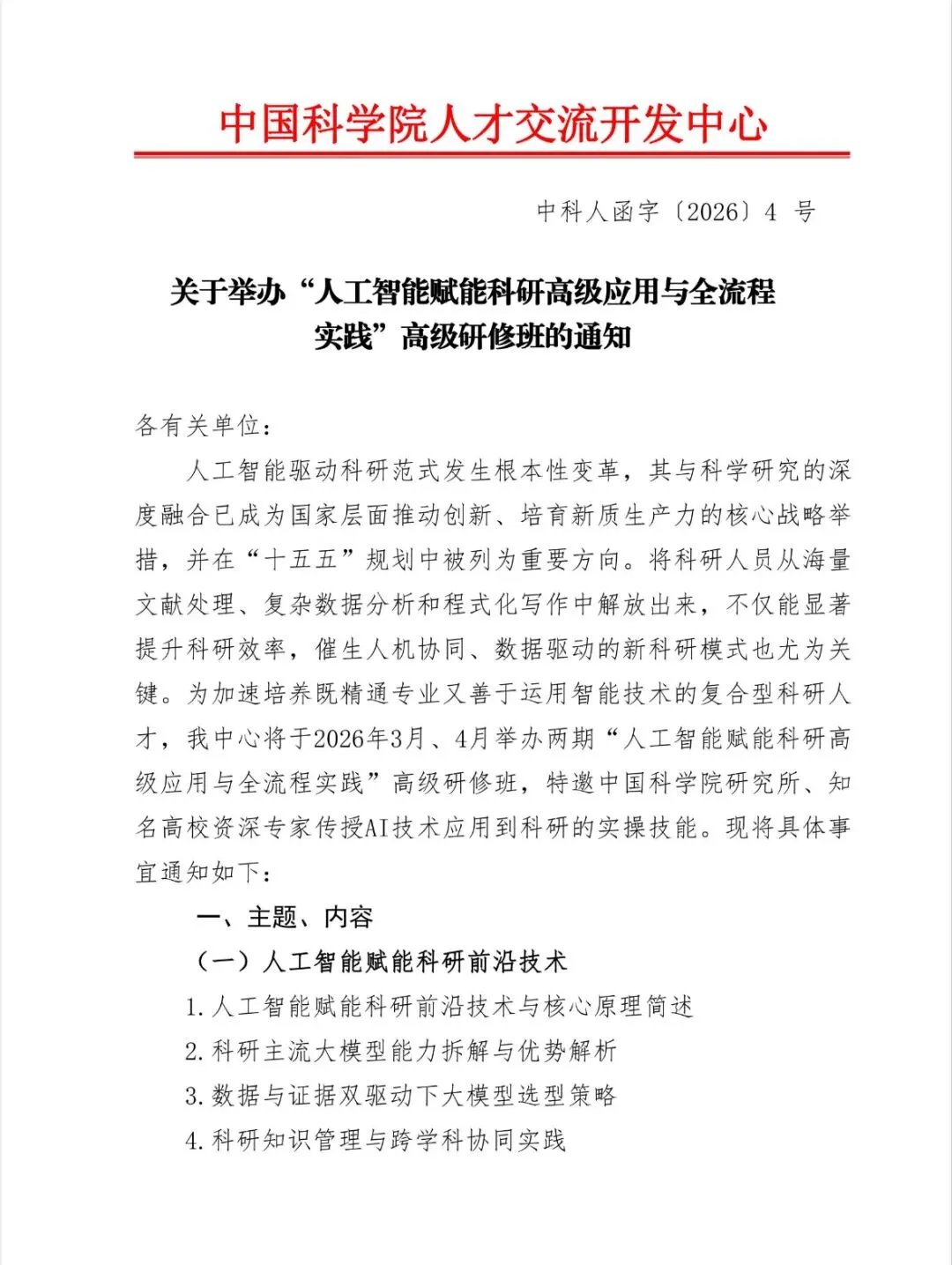 为帮助广大农业科研人员系统掌握AI赋能科研的核心能力,中国科学院人才交流开发中心依托中科院及顶尖高校专家资源,于2026年4-6月连续举办“人工智能赋能科研实践效能提升与智能体构建应用”高级研修班。