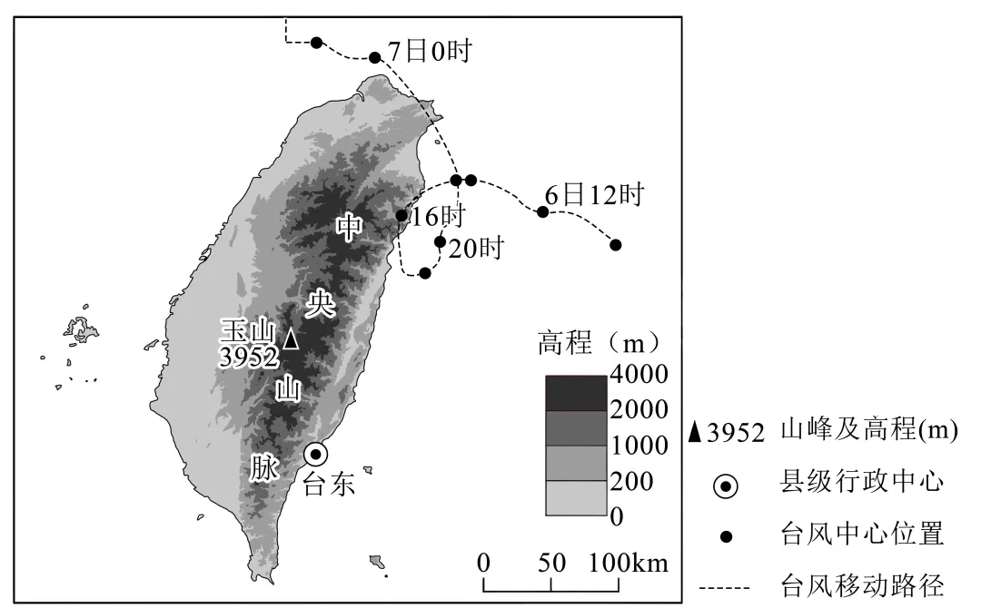 10月为我国台湾岛东部沿海地区水稻抽穗开花期。2007年10月6日15时30分,台风“罗莎”登陆台湾岛,七级风圈半径约430千米。6日14时,中央山以东的东部沿海局地气温升至36℃以上,湿度下降;16时,气温升至39℃;18时,仍高达35℃。同期,台湾岛西部沿海大部分地区气温稳定在24~26℃。下图示意台湾岛地形和该台风的移动路径。
