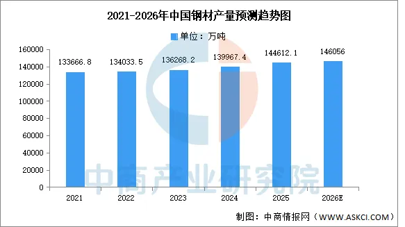 随着工业生产稳步回升,国内制造业用钢需求上升,我国钢材产量呈现平稳增长的趋势。中商产业研究院发布的《2025-2030年中国钢材行业市场分析及发展趋势预测报告》显示,2025年1-12月全国钢材产量144612.1万吨,同比增长3.1%。中商产业研究院分析师预测,2026年中国钢材产量将达到146056万吨。