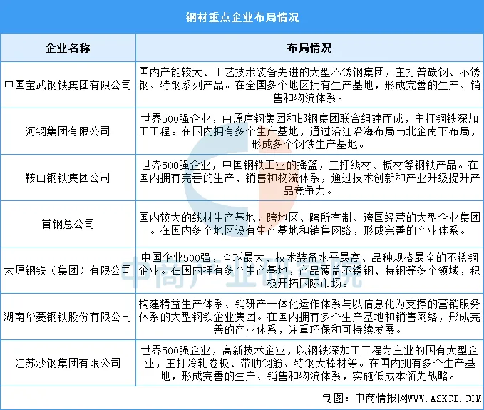 中国钢材企业众多,规模不一。在国企央企中,宝武集团、河钢集团、鞍钢集团、首钢集团等大型钢铁企业占据了主导地位。而在民企中,沙钢集团、建龙集团、敬业集团等也具有较强的竞争力。具体如图所示: