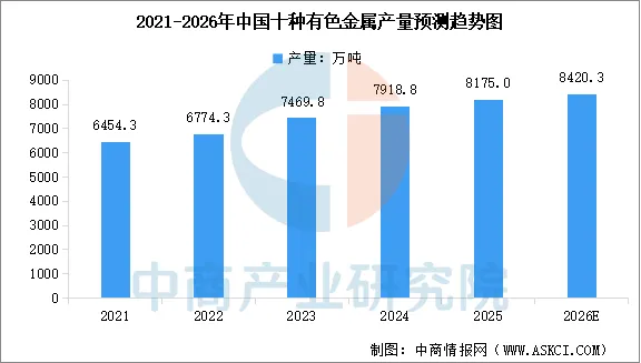 我国有色金属行业快速发展,已成为全球最大的有色金属生产国。中商产业研究院发布的《2025-2030年全球有色金属行业市场调研及投资前景预测报告》显示,2025年中国十种有色金属总产量为8175万吨,同比增长3.9%。中商产业研究院分析师预测,2026年中国十种有色金属产量将达到8420.3万吨。
