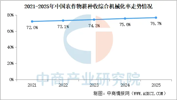 中商产业研究院发布的《2025-2030年全球及中国农业机械产业发展战略及供需格局研究预测报告》显示,近年来,全国农业科技装备支撑不断强化,农业现代化水平持续提升。2025年全国农作物耕种收综合机械化率达到76.7%,提前完成“十四五”目标任务。
