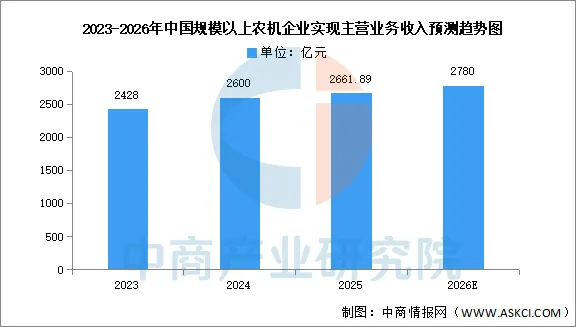 中商产业研究院发布的《2025-2030年全球及中国农业机械产业发展战略及供需格局研究预测报告》显示,2025年2327家规模以上农机企业业务收入总额为2661.89亿元,12个农机子行业中,有67%的子行业保持了增长,其中渔业机械的增幅最大。中商产业研究院分析师预测,到2026年中国规模以上农机企业业务收入总额将达2780亿元。