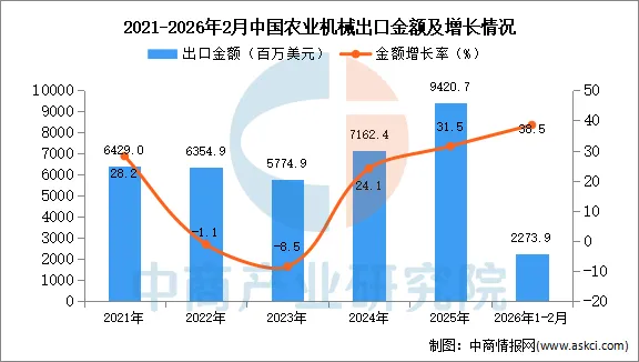 2025年我国农业机械的出口金额9420.7百万美元,同比增长31.5%。最新数据显示,2026年1-2月中国农业机械出口金额2273.9百万美元,同比增长38.5%。