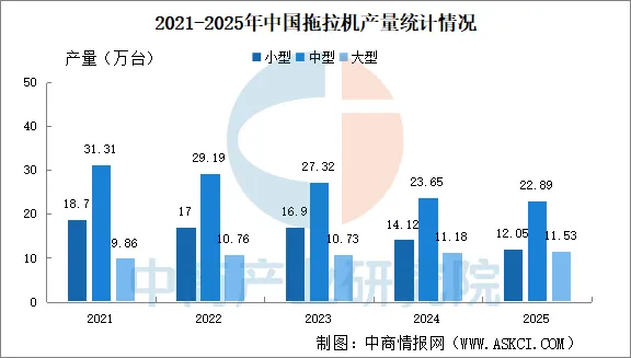 中商产业研究院发布的《2025-2030年全球及中国农业机械产业发展战略及供需格局研究预测报告》显示,近年来,全国农业机械产量一直保持较高水平。2025年全国小型拖拉机产量12.05万台,同比减少15.4%。中型拖拉机产量22.89万台,同比减少6%。大型拖拉机产量11.53万台,同比增长1.4%。