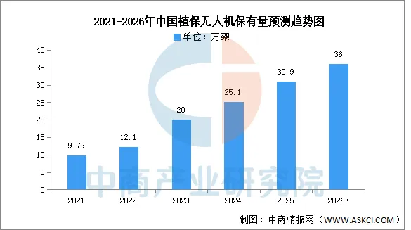 中商产业研究院发布的《2025-2030年全球及中国农业机械产业发展战略及供需格局研究预测报告》显示,2025年全国植保无人机保有量达30.9万架,作业面积30.4亿亩次,保有量和作业面积继续稳居世界首位。中商产业研究院分析师预测,到2026年,中国植保无人机保有量将达36万架。