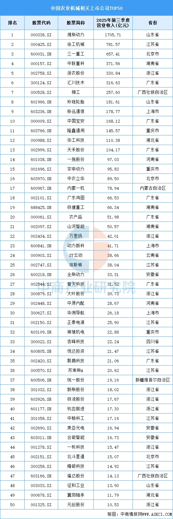目前,A股相关农业机械营收前五十上市企业中,浙江省数量最多,共8家。江苏省和广东省均为7家,并列第二。