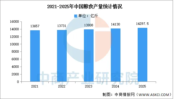 2025年,多措并举稳定粮食播种面积,进一步扩大粮食单产提升工程实施规模。2025年,全国粮食产量14297.5亿斤,比上年增加167.5亿斤,增长1.2%,连续两年稳定在1.4万亿斤以上。