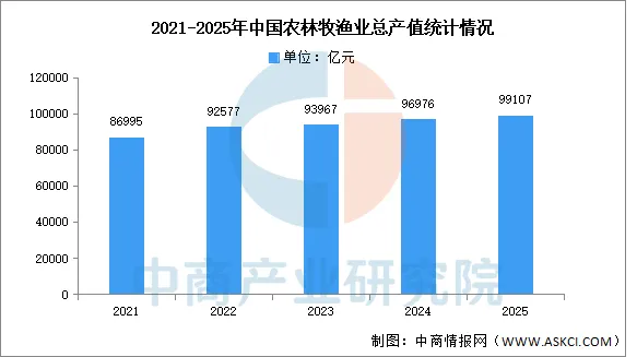 随着农业的蓬勃发展,我国农林牧渔业总产值实现较快增长。经初步核算,2025年全年中国农林牧渔业总产值达99107亿元,比上年同期增长4.1%。