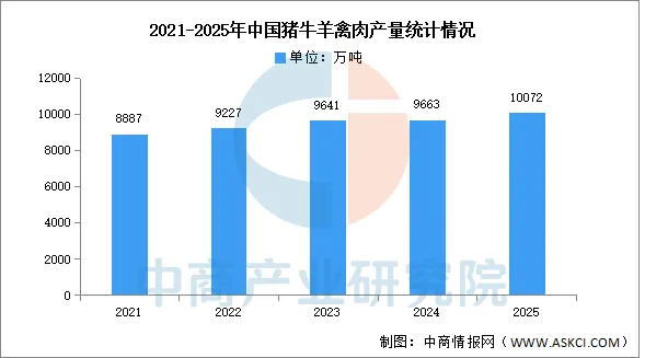 2025年,全国畜牧业生产形势较好,猪牛羊禽肉产量突破亿吨,为10072万吨,比上年增加409万吨,增长4.2%。其中,猪肉产量5938万吨,增加232万吨,增长4.1%,产量创历史新高。