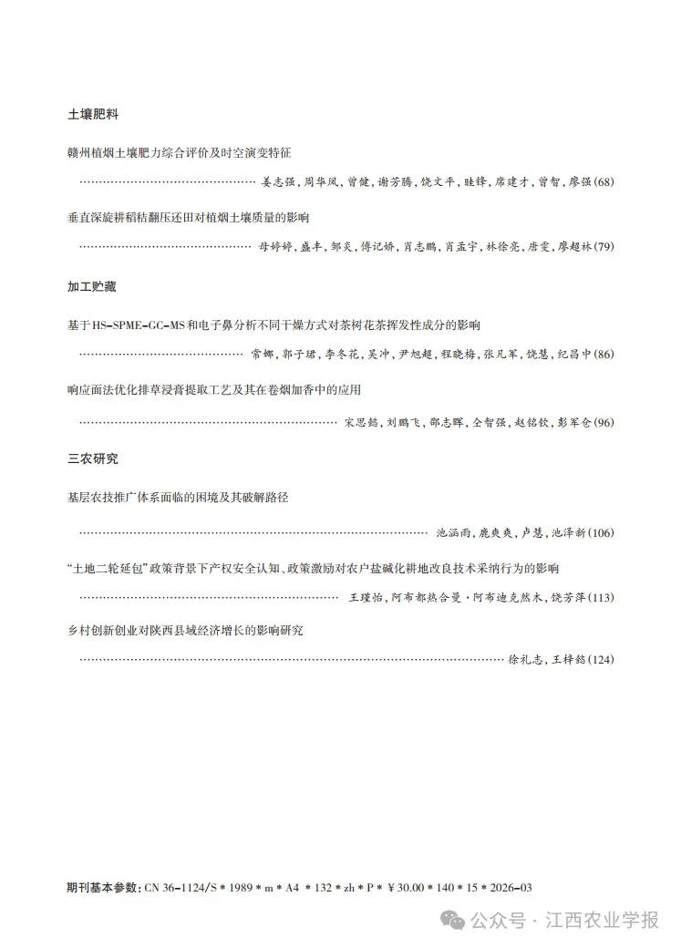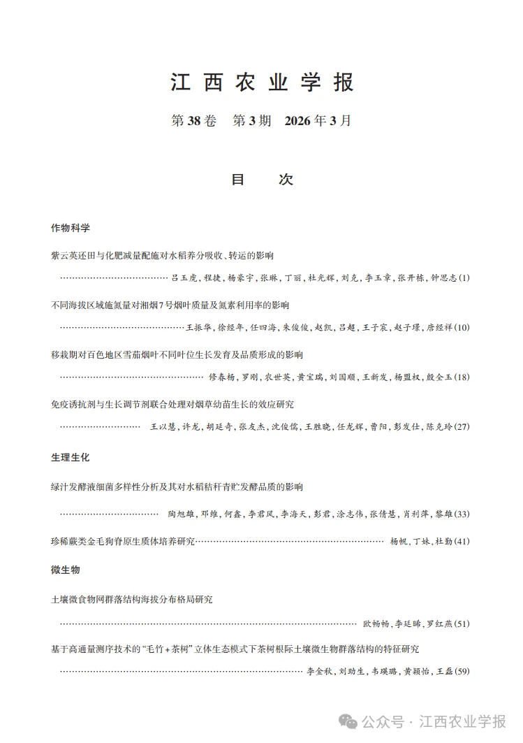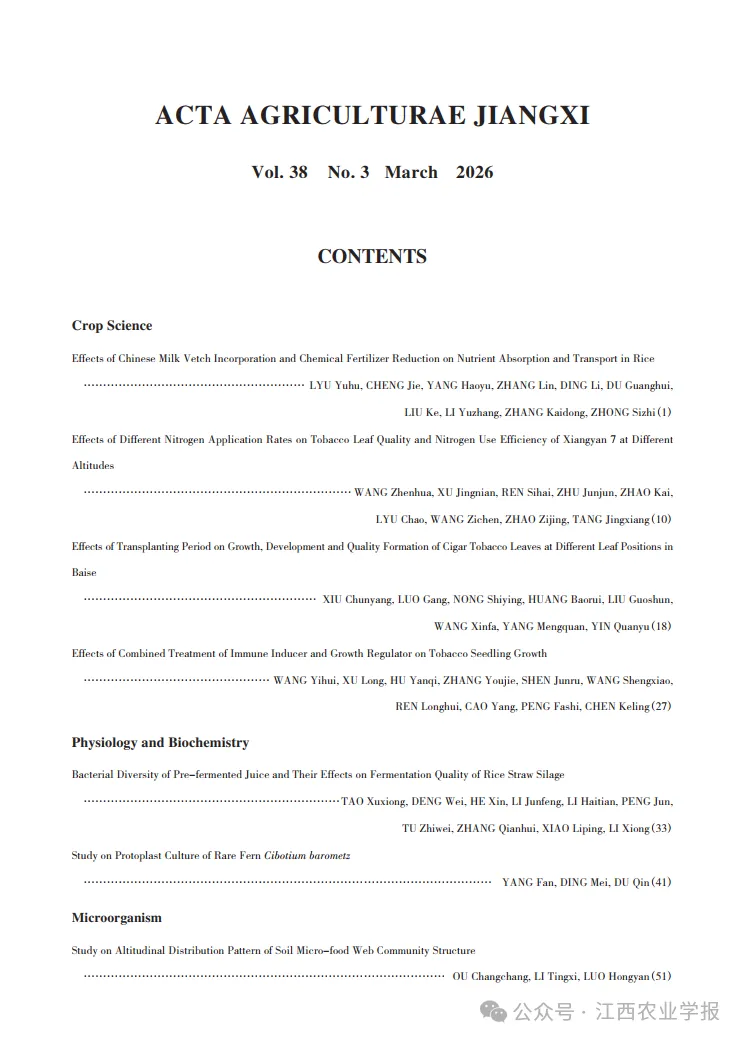 《江西农业学报》创刊于1989年,是由江西省农业科学院和江西省农学会共同主办的有关农业和林业科学的综合性学术期刊。本刊是中国科技核心期刊(中国科技论文统计源期刊)、RCCSE中国核心学术期刊(武大版核心期刊)、中国农林核心期刊、全国优秀农业期刊、华东地区优秀期刊、江西省优秀期刊。《江西农业学报》现为月刊主要栏目包括:作物科学、植物保护、植物生理、土壤肥料、园林园艺、农业工程、农业经济、水产养殖、农业气象、生物技术、农产品加工贮藏、食品质量与安全、资源环境、三农研究。