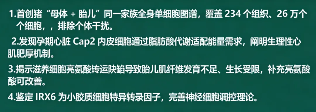 ⭐ 总之,这项研究构建的猪母子单细胞图谱,为解析妊娠生理与胎儿发育提供了全新视角。这些发现不仅深化了细胞调控认知,更为人类孕期保健与胎儿生长受限防治提供了可靠转化依据。