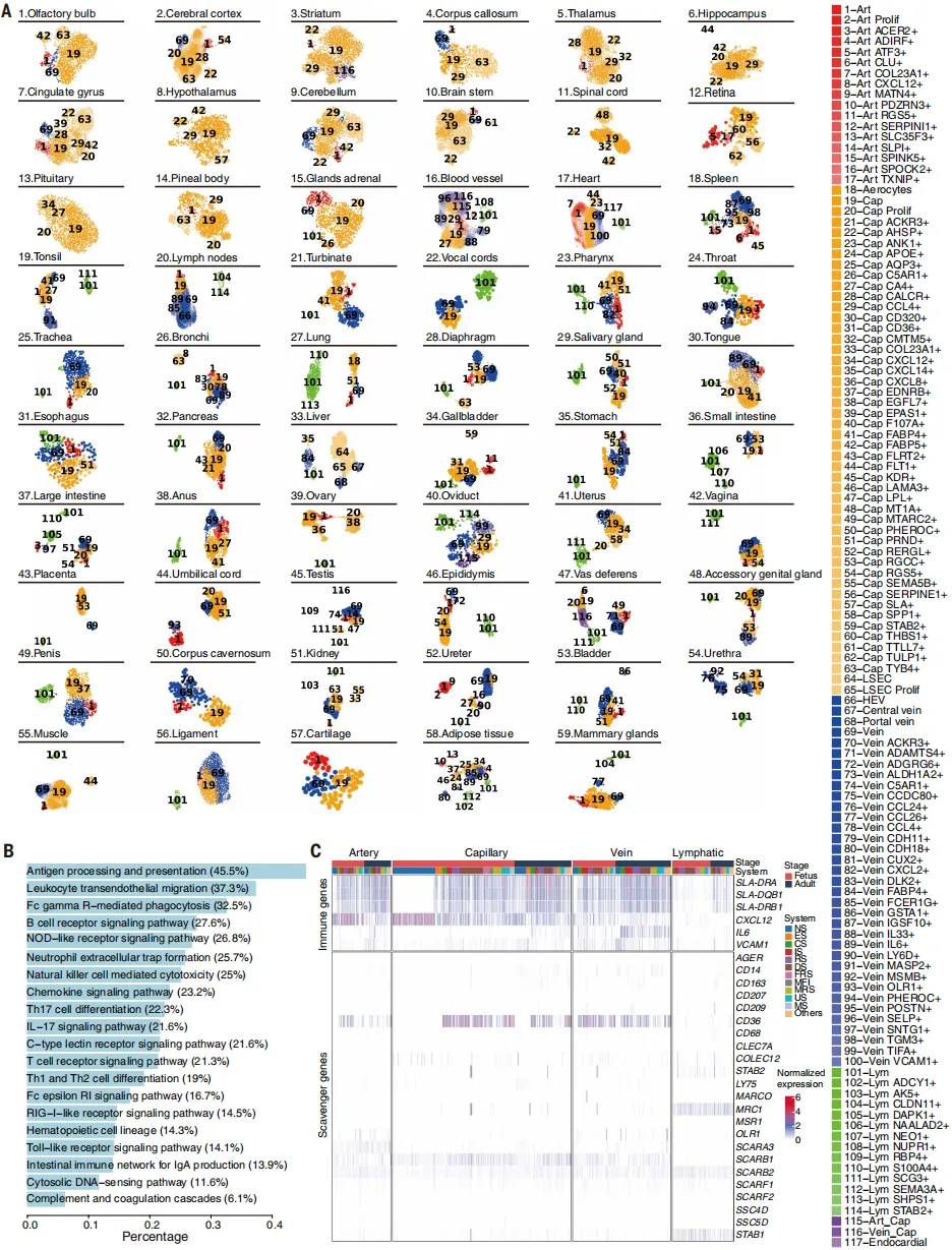 构建猪母子全组织单细胞图谱,获 256 万细胞数据,鉴定 76 种主细胞型、412 种内皮亚型。