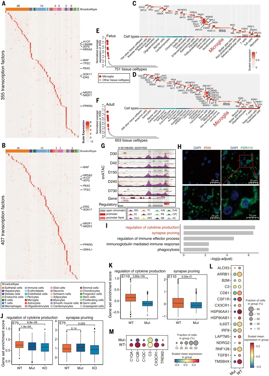 筛选出组织特异转录因子,证实IRX6为小胶质细胞特异因子,调控突触修剪与细胞因子分泌。