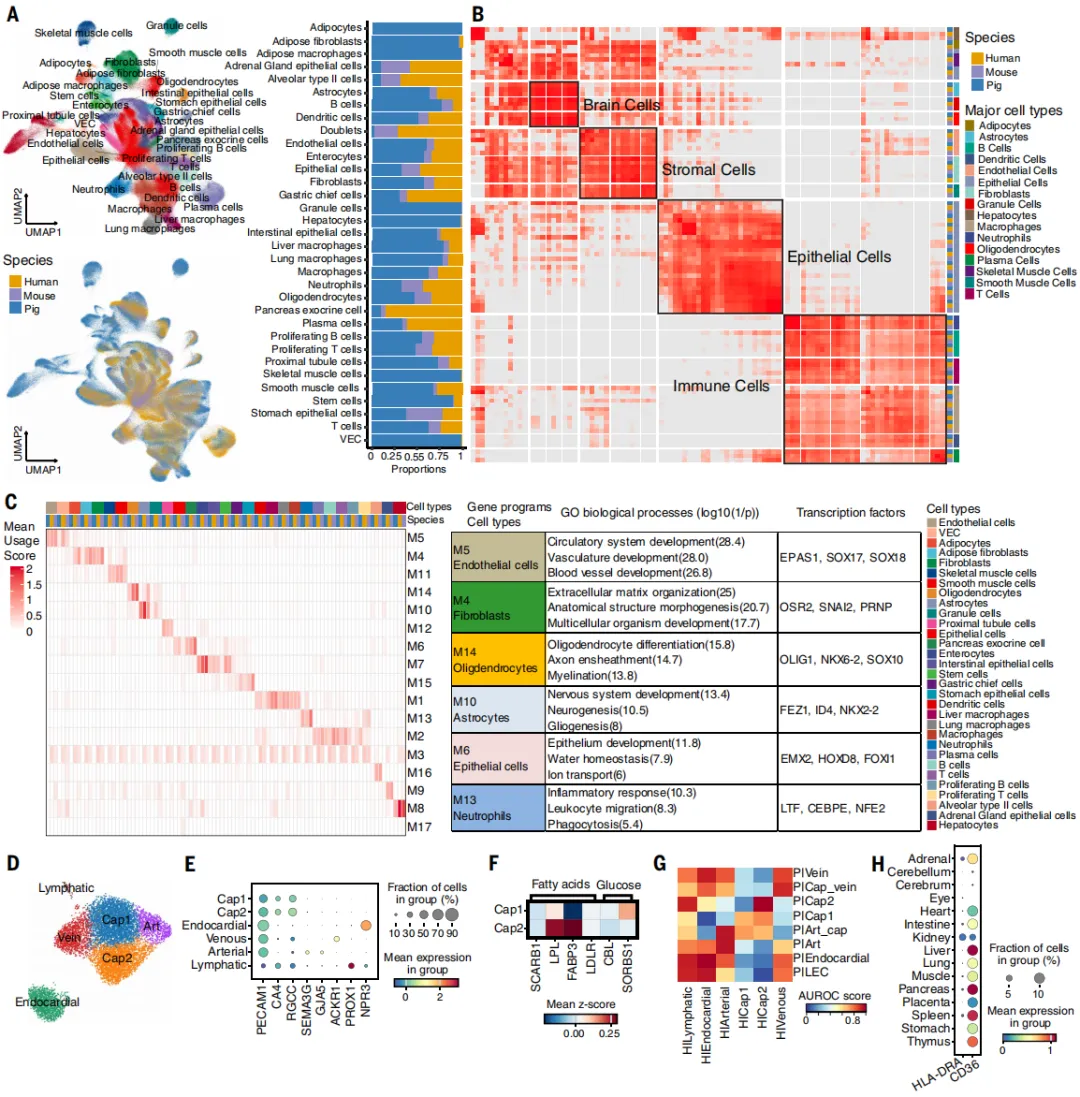 (比较分析显示猪、人类和小鼠之间存在细胞类型及基因表达程序的跨物种保守性。)