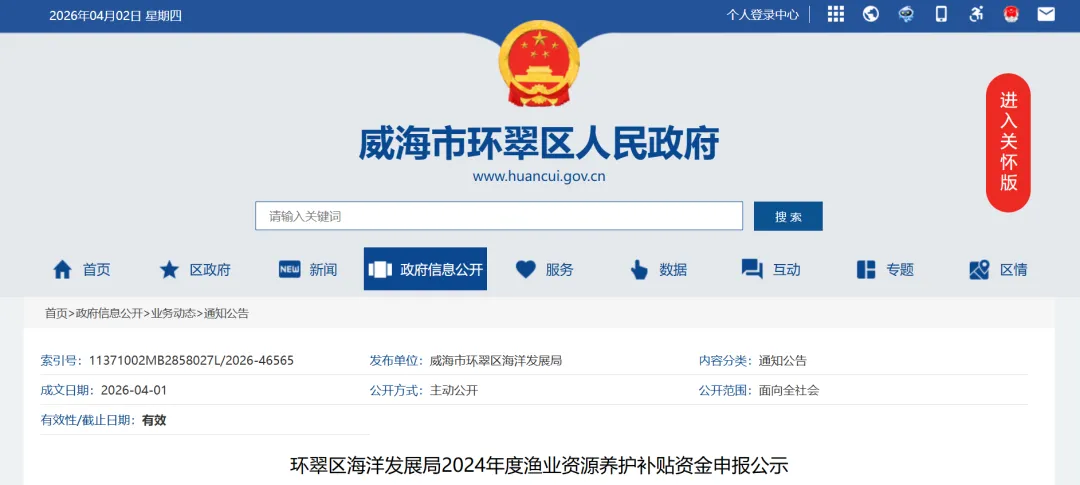 根据《山东省落实渔业发展支持政策推动渔业高质量发展实施方案》和《山东省海洋渔业资源养护补贴实施方案》要求,我区已完成2024年度渔业资源养护补贴的申报工作,根据海洋渔业资源养护补贴发放的相关规定,现对环翠区2024年度渔业资源养护补贴申报结果进行公示,公示期自2026年4月1日至4月7日,公示期内接受社会监督,公示期内如有异议,请向环翠区海洋发展局反映相关情况,监督电话:0631-5122031。
