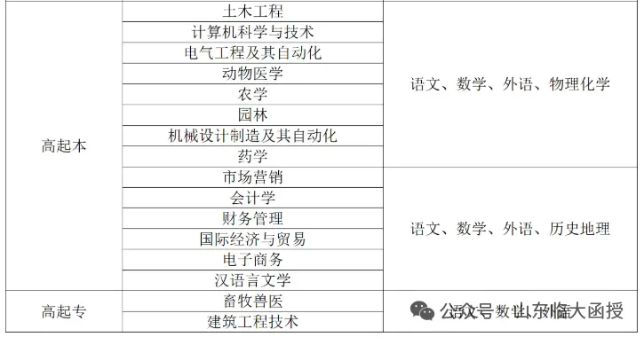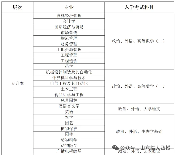 专升本:国际经济与贸易、汉语言文学、英语、机械设计制造及其自动化、电气工程及其自动化、计算机科学与技术、土木工程、食品科学与工程、风景园林、农学、园艺、植物保护、动物科学、动物医学、园林、药学、工程管理、工程造价、市场营销、会计学、财务管理、农林经济管理、土地资源管理、物流管理、广播电视编导