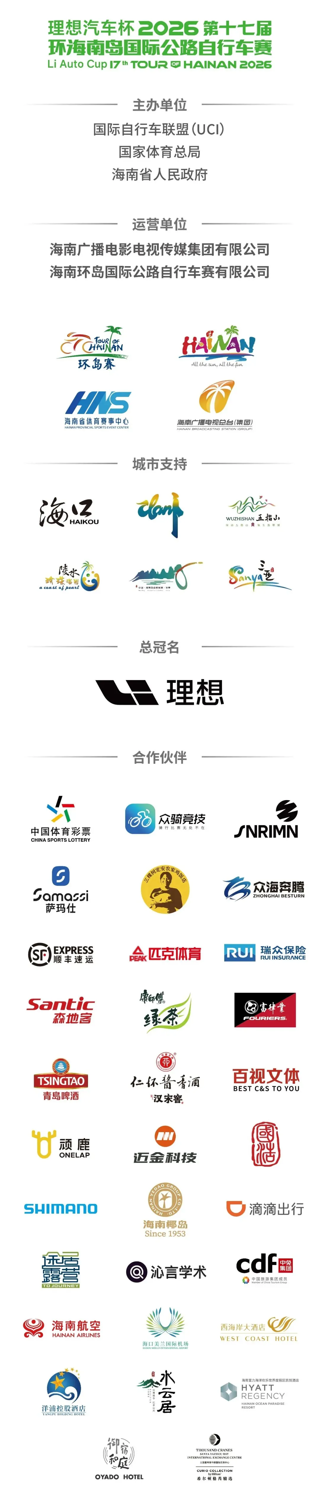 “理想汽车杯”2026第十七届环海南岛国际公路自行车赛由国际自行车联盟(UCI)、国家体育总局和海南省人民政府共同主办,中国自行车运动协会、海南省旅游和文化广电体育厅、海口市人民政府、三亚市人民政府、儋州市人民政府、五指山市人民政府、陵水黎族自治县人民政府、保亭黎族苗族自治县人民政府承办,澄迈县人民政府、临高县人民政府、白沙黎族自治县人民政府、昌江黎族自治县人民政府、乐东黎族自治县人民政府、琼中黎族苗族自治县人民政府,海南省体育赛事中心、海南省体育彩票管理中心协办,海南广播电影电视传媒集团有限公司、海南环岛国际公路自行车赛有限公司运营。