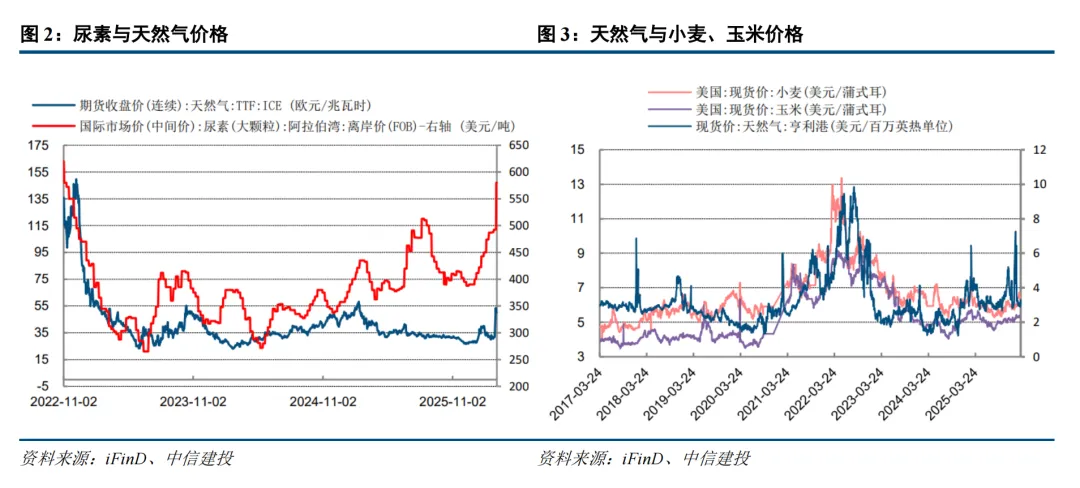 氮肥(尿素、硝酸铵)的成本刚性:天然气是合成氨的主要原料(占氮肥生产成本的60%-80%)。在中东冲突导致天然气供应担忧加剧时,欧洲和亚洲的天然气现货价格极易飙升。气价上涨直接推高了尿素的生产成本,进而传导至终端农产品。