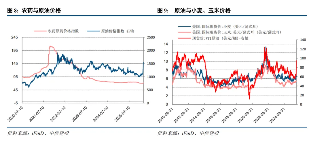 2.能源成本抬升形成刚性约束,种植端供给响应能力弱化。玉米是典型的能源密集型农作物,化肥、农药、农机燃油等农资成本占种植总成本的比重为15-25%,其价格与原油价格高度绑定,形成 “原油价格→农资价格→玉米种植成本” 的强传导链条。2026 年美伊地缘冲突将推升油价中枢上行,进而带动全球化肥、农药价格进入上行通道,玉米种植边际成本刚性抬升。成本端压力若无法通过价格顺畅传导,将直接压缩农户种植利润,进而抑制种植意愿与田间管理投入,弱化供给端的短期响应能力。