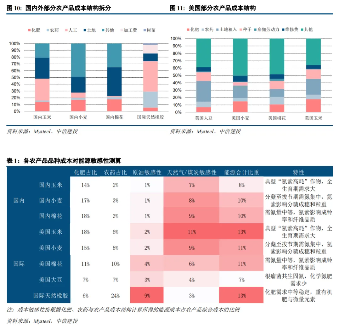 农产品中,玉米、小麦、天然橡胶、棉花和大豆的综合成本结构中化肥和农药成本占比区间约14-30%。整体来看,美国玉米和天然橡胶的综合成本相对能源价格更加敏感,美国玉米综合成本中,化肥和农药分别占18/6%,即天然气和原油占综合成本比重11/2%;国际天然橡胶综合成本中,化肥和农药分别占6/24%,即天然气和原油占综合成本比重3/9%。