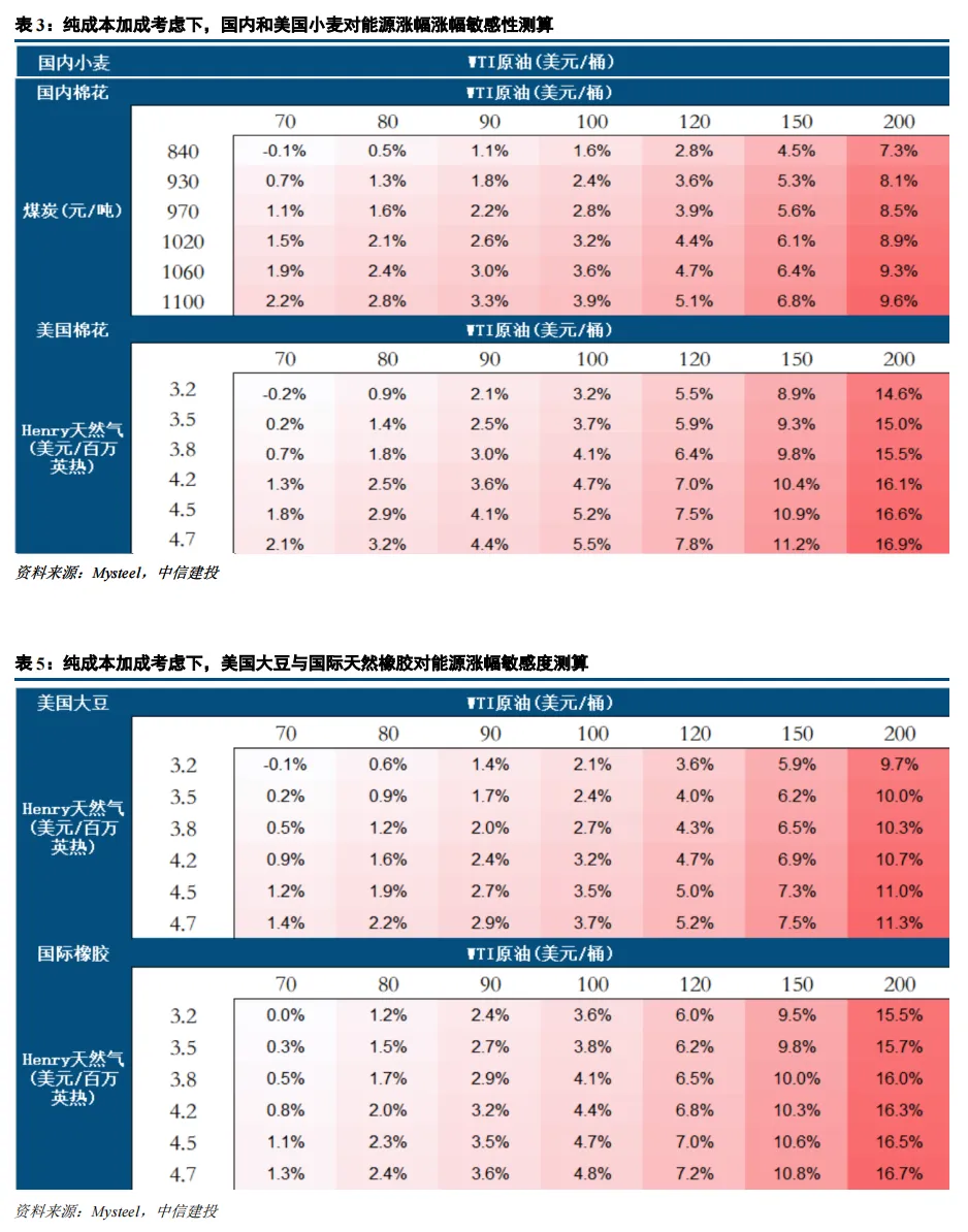 ③假定各品种种植毛利率为15%,并设定不同能源价格的场景分别测算农产品价格的涨幅。