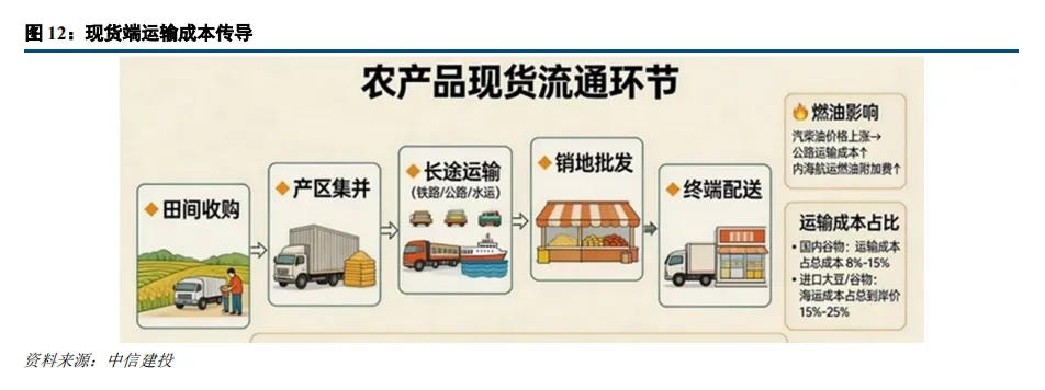 原油价格飙升传导的汽柴油价格上涨也会通过运输成本渠道影响农产品价格。农产品从产地到消费终端需经历多层级运输:田间收购→产区集并→长途运输(铁路/公路/水运)→销地批发→终端配送。汽柴油价格上涨直接影响公路运输成本及内河航运燃油附加费。