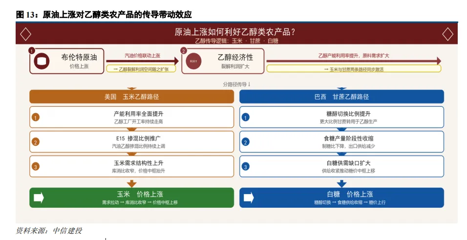 核心机制:原油→汽油→乙醇裂解利润→农产品需求。布伦特原油上涨推升汽油价格,乙醇经济性凸显,乙醇加工产能全力开动,直接拉动上游原料需求。