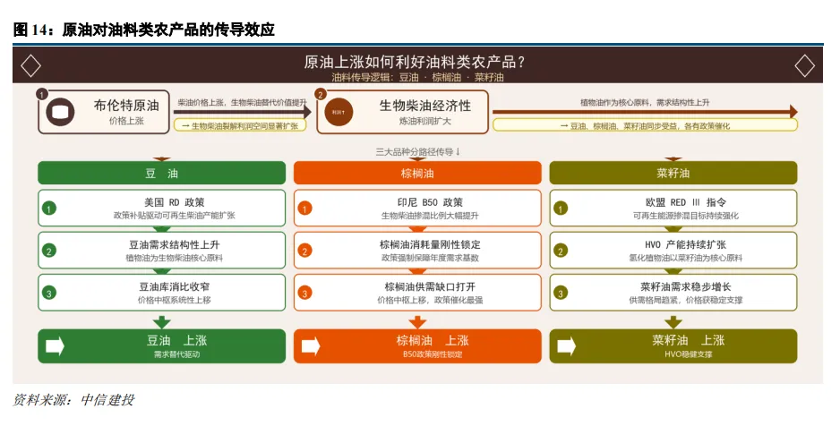 核心机制:原油→柴油→植物油需求。柴油价格上涨提升生物柴油替代价值,以豆油、棕榈油、菜籽油为原料的可再生柴油产能扩张,植物油从食用消费转向工业消费。分品种传导: