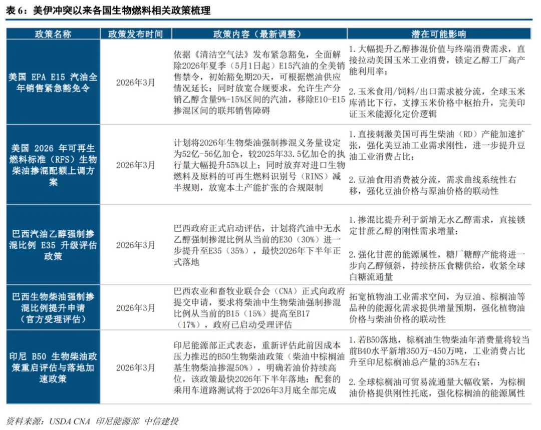 美伊冲突加速全球生物燃料政策松绑,农产品能源需求上限系统性打开。 美国EPA紧急豁免E15全美销售并大幅上调生物柴油掺混义务,巴西、印尼相继推进汽油乙醇及生物柴油掺混比例提升,玉米、豆油、白糖、棕榈油的工业消费刚性显著增强。需求曲线系统性右移之下,农产品定价的“能源锚”或正在从边际走向主导。