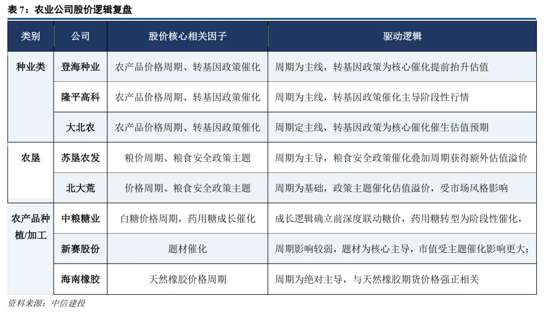 政策、事件及产业主题作为周期主线的补充,催化股价的阶段性波动与高度。种业龙头登海种业、隆平高科对转基因商业化等产业政策高度敏感,股价往往在周期基础上提前抢跑于业绩兑现;农垦标的北大荒、苏垦农发依托农垦改革、粮食安全核心主题获得额外估值溢价;中粮糖业的药用糖转型、新赛股份/新农开发的区域题材等依靠主题催化在周期主线中实现估值阶段性上行。