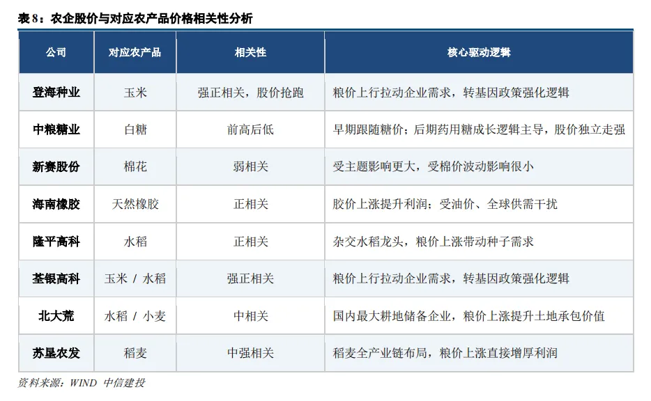 3)分层受益特征: 具备规模化种植基地、核心农资产能、渠道与技术优势的龙头企业,能够充分兑现粮价上涨与政策红利,实现业绩稳步提升;而中小农业企业多受短期情绪炒作驱动,缺乏基本面支撑,难以持续分享行业红利。