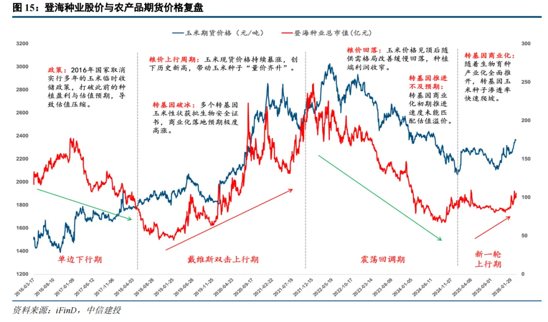 与此同时,作为上游种企,登海种业股价与农产品价格呈现出较高的相关性。玉米、大豆等主粮期货价格上涨,直接提升了农户的种植收益。种植意愿和积极性的提高,会逐步传导至上游,表现为农户对优质种子(特别是高价种子、转基因种子)的需求增加。2020年后的同步大涨,核心驱动力是转基因玉米产业化政策预期,期货价格上涨强化了这一产业逻辑。