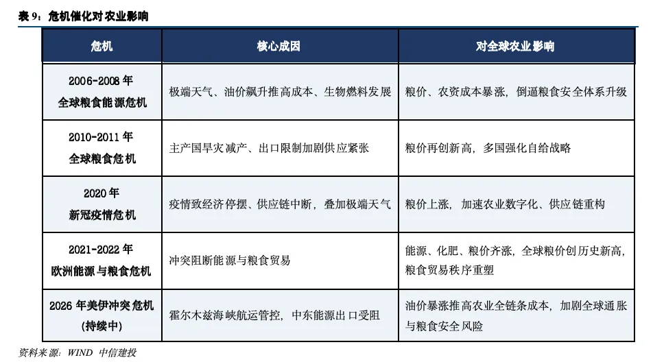 21世纪以来,全球共经历四次大规模的粮食与能源危机:2006-2008年粮食与能源共振危机,2010-2011年主产国极端天气与出口政策引发的粮食危机,2020年新冠疫情导致的粮食与石油双重危机,以及2022年俄乌冲突引发的全球能源与粮食危机。当前,美伊冲突导致霍尔木兹海峡航运受阻,油价快速攀升,全球能源安全再度承压。在此背景下,复盘历史上危机催化对农业企业的影响,具有较强的现实参考意义。