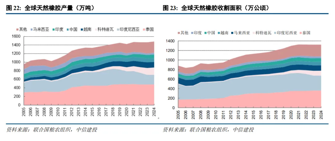 割胶劳动强度大、工作时段特殊,年轻一代胶农流失严重。与此同时,棕榈油等竞争作物的比价优势使得印尼、马来西亚等国出现大规模土地用途转换。考虑到目前胶价对农业从业者并无吸引力,因此,全球短中期内天然橡胶种植面积整体无扩大的动机,甚至可能会出现削减的情况。