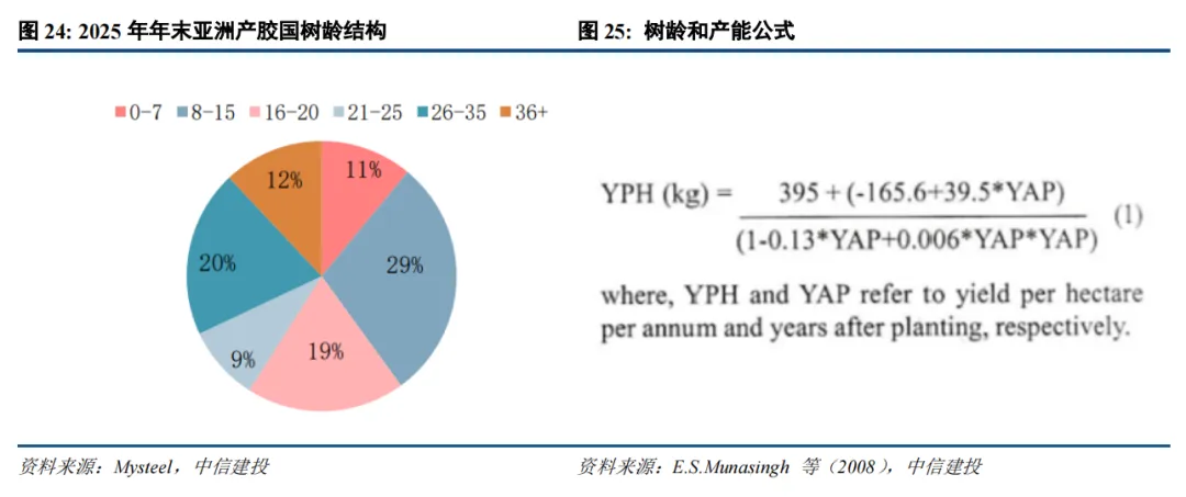 供给侧:天然橡胶短期供应弹性较大,但长期产能周期约束同样值得关注。橡胶树约7年才能进入旺产期,这意味着当下的供应潜力早在十年前就已基本确定。2011-2013年的种植高峰对应的胶树目前仍处于产胶壮年,但产能增速已明显放缓,且高龄树占比正缓慢提升。我们认为,供给端正在发生三个值得关注的变化: