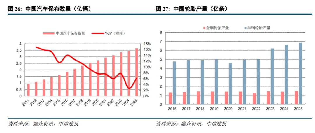 ①下游:全球70%天然橡胶用于轮胎行业,轮胎需求可分为配套增量需求和替换存量需求。替换市场具有较强的稳定性和需求刚性,即使在经济压力增大的情况下,消费者仍然会考虑进行轮胎更换。目前国内汽车保有量持续增长,为轮胎替换需求提供支撑基础。
