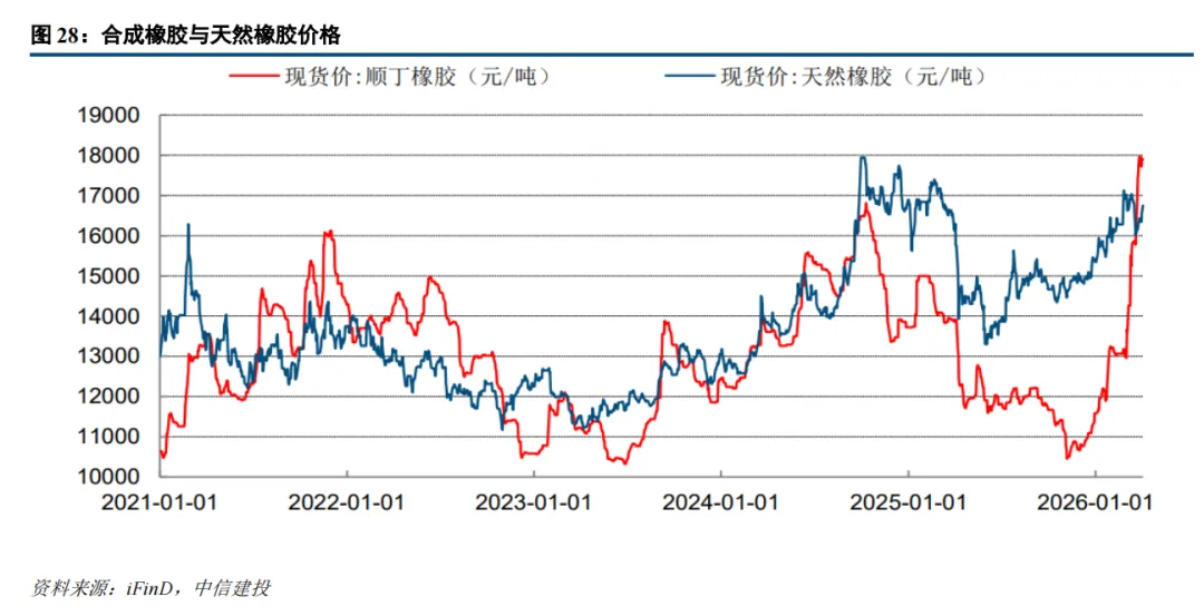 ②替代品:油价飙升推高合成橡胶价格,天然橡胶替代性凸显。2026年2月底美伊冲突以来,油价飙升,而合成橡胶(如顺丁橡胶)是典型的石油化工产品。其生产所需的核心单体(如丁二烯、苯乙烯等),绝大部分来源于原油裂解(乙烯裂解装置)的副产品,原油价格上升带动合成橡胶价格走强,合成橡胶价格高位运行下,作为一定程度的替代品的天然橡胶的经济性凸显,下游对于天然橡胶接货意愿整体提升。