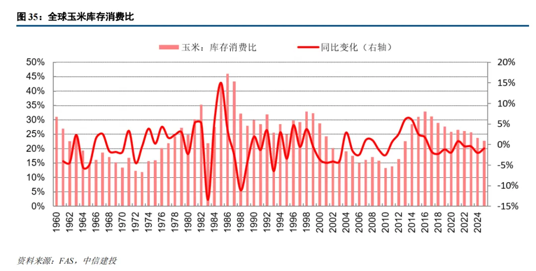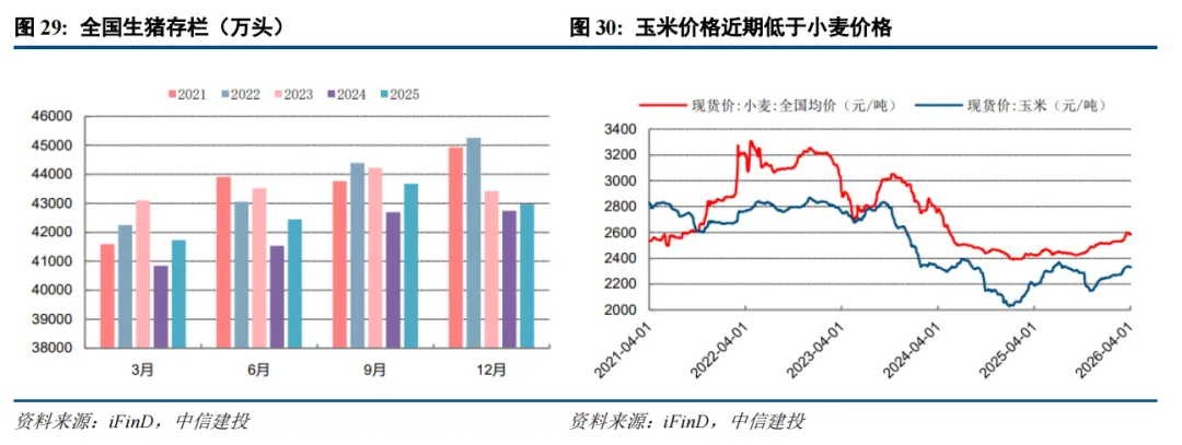 1.饲用与食用需求构成刚性基本盘,增长保持平稳。全球玉米消费中60%以上来自饲用领域,构成了玉米消费的底层支撑。2025年生猪养殖行业进入去化中后期,生猪存栏量触底回升,叠加中国、印度等新兴市场居民肉蛋奶消费升级持续,有望带动玉米饲用需求保持平稳增长。同时,当前小麦、大麦等替代谷物与玉米的价差持续收窄,部分主产区小麦价格已高于玉米价格,饲料端的谷物替代效应基本消退。