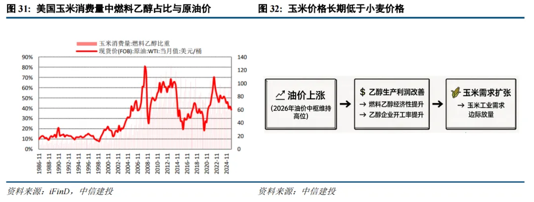 2. 生物燃料需求成为弹性来源,与油价形成正向联动。当前全球生物燃料产业已高度成熟,这是 70 年代两次石油危机时期不具备的核心产业变化。目前美国玉米消费量用于燃料乙醇生产的比例整体较高,玉米正在从传统的“粮饲”二元品种,转变为 “粮饲能” 三元属性品种,与能源价格的联动性大幅增强。2026年若油价中枢维持高位,将直接提升燃料乙醇的生产经济性,带动乙醇生产企业开工率提升,进而形成对玉米工业需求的边际放量,有望构建起 “油价上涨 - 乙醇生产利润改善 - 玉米需求扩张” 的正向循环。