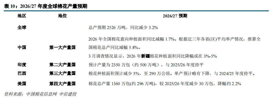 产量角度,全球减产预期较为明朗。中国国内供给端,供给刚性下降的预期已定。2026年政策层面新疆棉花种植面积将以3600万亩为目标,较往年缩减超10%,目前正以"七个优先退出"和"一个优先录入"的方式渐进推行中,3月调查情况显示,2026年新疆棉花种植面积同比降幅或在3%-5%。