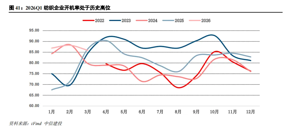 春节后棉纺织企业开机率快速恢复并维持高位。截至2026年2月末主流地区纺企开机负荷约88%,其中新疆地区维持90%以上高开工水平,同比回升幅度明显。纺织服装在棉花下游消费中占比超80%,是棉花需求的绝对主力,下游开工强度的提升直接拉动棉花消费。
